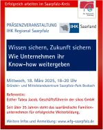 Referentin: Esther Tabea Jacob, Geschäftsführerin sikos GmbH 18.03.2026, 18 Uhr Gründer- und Mittelstandszentrum, Saarpfalz-Park 1, 66450 Bexbach In Zeiten von Fachkräftemangel, steigender Fluktuation und dem Eintritt erfahrener Mitarbeitender in den Ruhestand wird das Sichern von Erfahrungswissen für kleine und mittlere… weiter„Wissen sichern, Zukunft sichern – Wie Unternehmen ihr Know-how weitergeben“, IHK Regional, 18.03.26, 18 Uhr