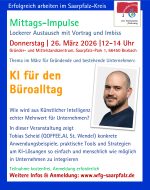 Tag: Donnerstag | 26. März 2026 | 12 -14 Uhr Veranstaltungsort: Gründer- und Mittelstandszentrum, EG, Saarpfalz-Park 1, 66450 Bexbach Entgelt: kostenfrei, Anmeldung erforderlich Wie wird aus Künstlicher Intelligenz echter Mehrwert für Unternehmen?​​​​​​ In dieser Veranstaltung zeigt Tobias Scheid (QOFFEE.AI, St. Wendel) konkrete Anwendungsbeispiele, praktische Tools und Strategien um… weiterKI für den Büroalltag, Mittagsimpuls, 26.03.26, 12 – 14 Uhr